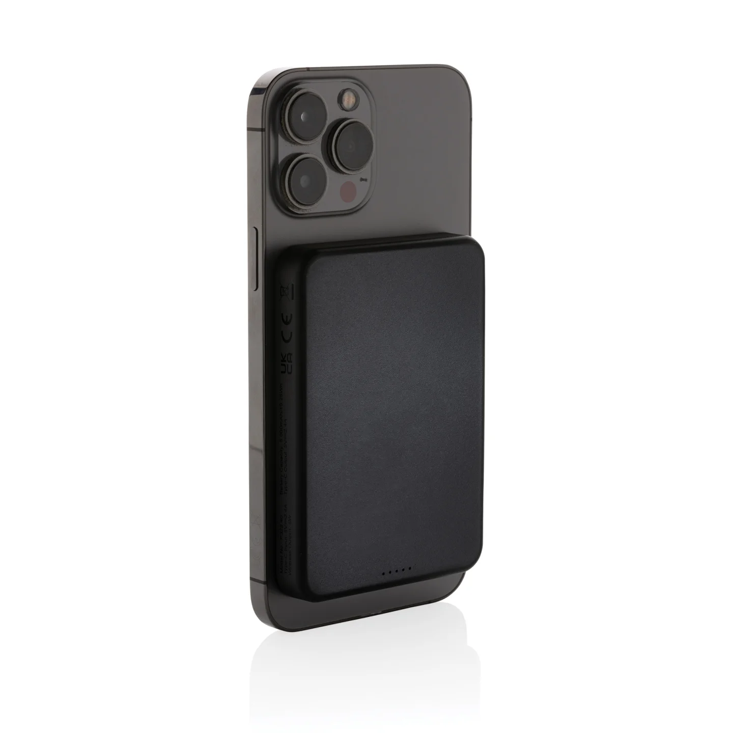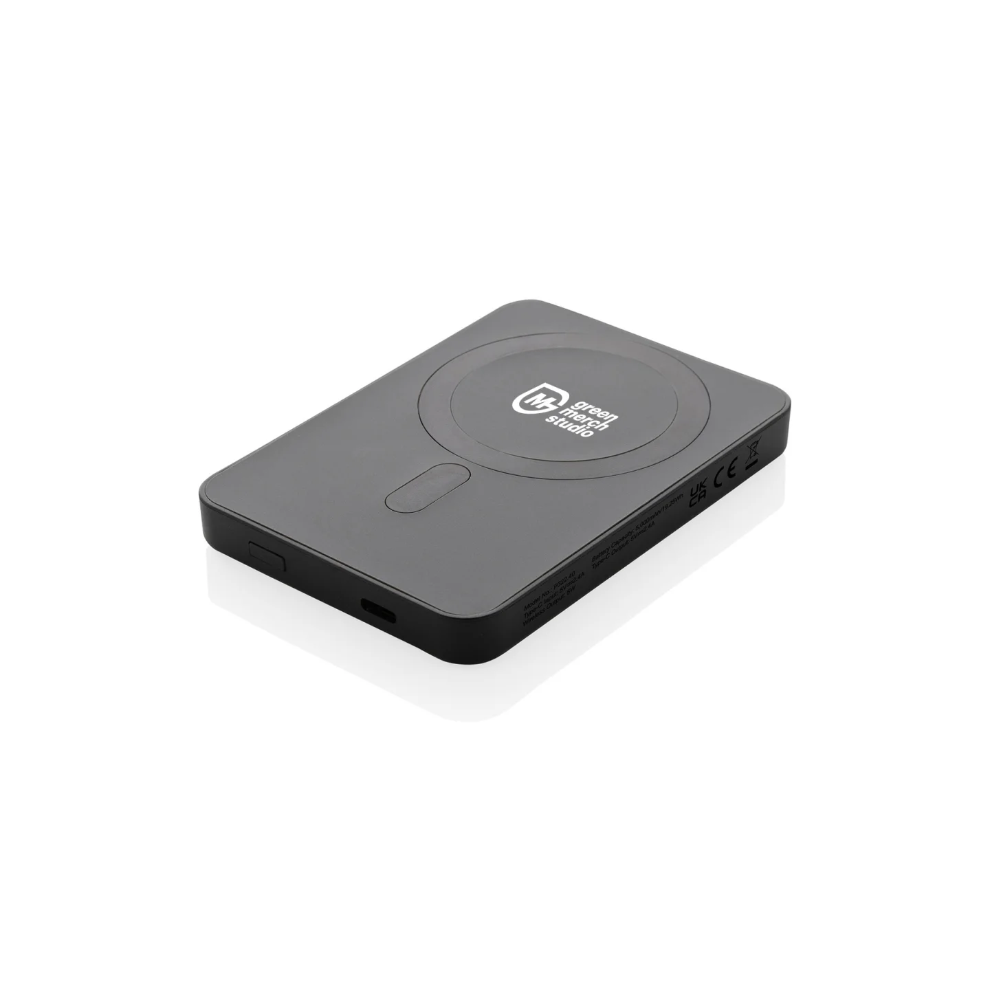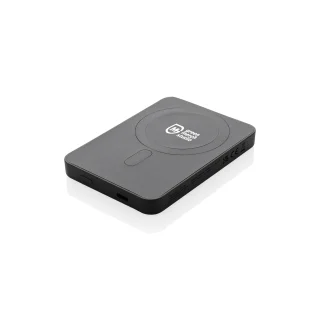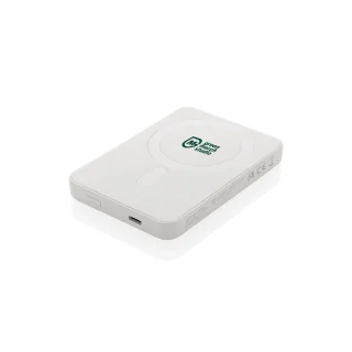 Snap on and charge. No cables needed. This pocket‑size 5,000 mAh power bank delivers 5W magnetic wireless charging for compatible phones (MagSafe alignment) and Qi wireless charging for others, with a USB‑C port for wired top‑ups. The casing is made from RCS‑certified recycled ABS for a lower‑impact choice. Finished with your logo, it becomes a smart everyday charger that keeps your brand in view, wherever it goes.